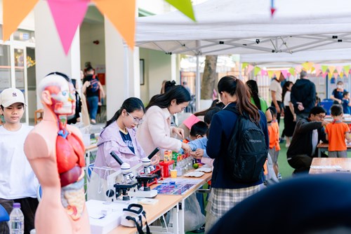 One of the highlights of Open Day 2026 was the wall-less classroom model. Experience stations were arranged as outdoor mini classrooms, allowing students to move freely, observe, and participate flexibly in learning activities. Organising learning in open spaces not only created a comfortable and engaging atmosphere, but also clearly reflected Sakura – Olympia’s experiential education approach—learning connected to real-life contexts.