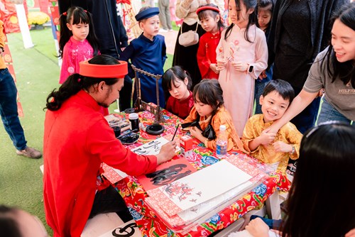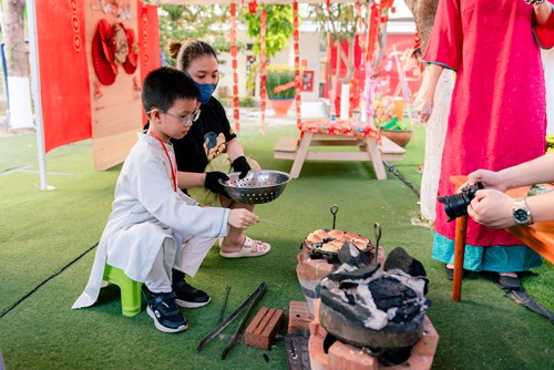 At the calligraphy booth, students learned about the meaning of each character, felt the spiritual values of Tet, and appreciated the beauty of folk culture. The candied fruit and bánh thuẫn making booth offered a traditional culinary experience, where students practiced patience, dexterity, and teamwork.
