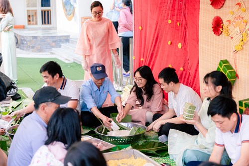 The bánh chưng wrapping booth was filled with the fragrant aroma of glutinous rice, mung beans, and pork.